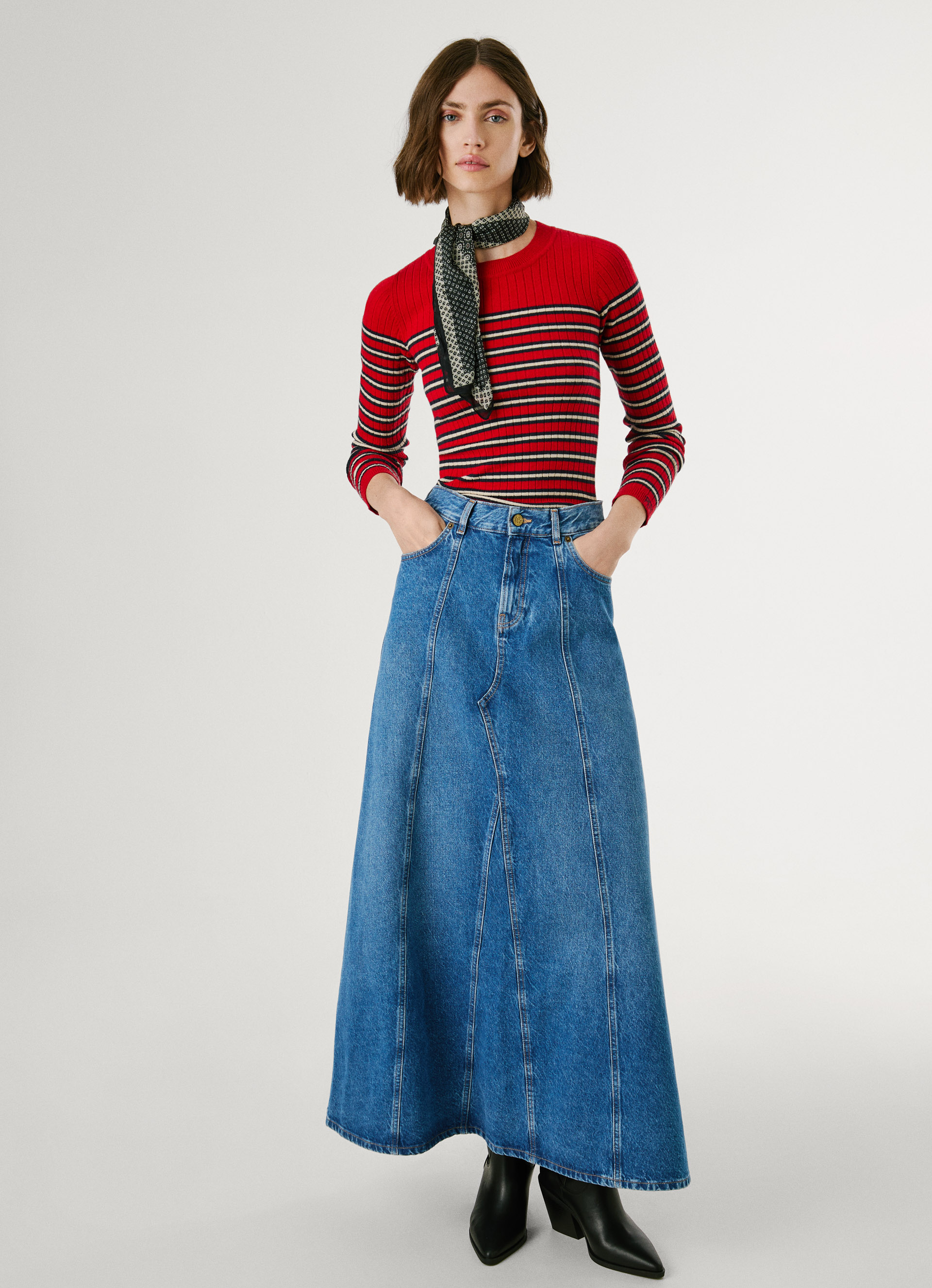 Wir haben nachhaltige und recycelte Materialien für dieses Kleidungsstück verwendet, einschließlich eines oder mehrerer der folgenden: Lyocell Lenzing®, Viskose, nachhaltige Baumwolle, recycelte Baumwolle, recyceltes Polyester und Nylon.- Langer Rock aus starrem Denimstoff