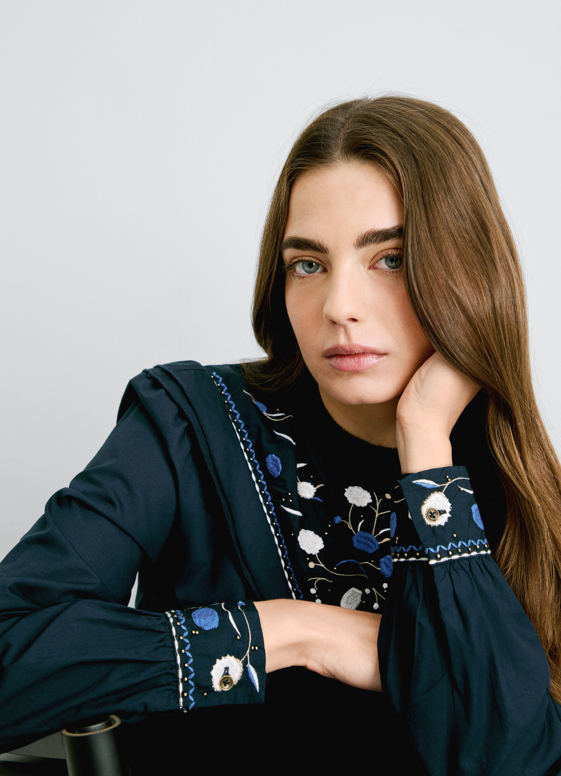- Dreieckiges Vorderteil mit floralen Stickereien