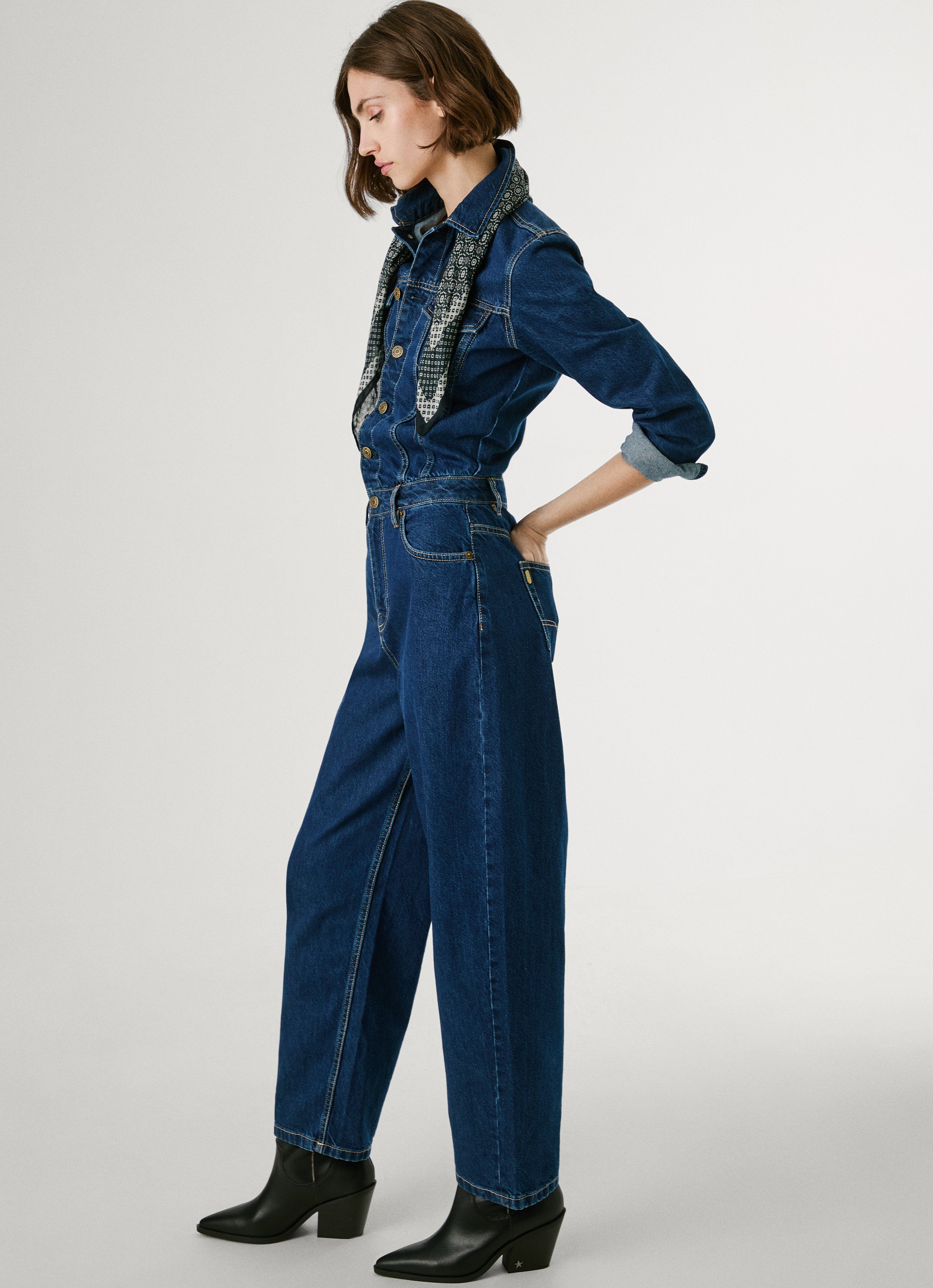 Wir haben nachhaltige und recycelte Materialien für dieses Kleidungsstück verwendet, einschließlich eines oder mehrerer der folgenden: Lyocell Lenzing®, Viskose, nachhaltige Baumwolle, recycelte Baumwolle, recyceltes Polyester und Nylon.- Langer Jumpsuit aus starrem Denimstoff