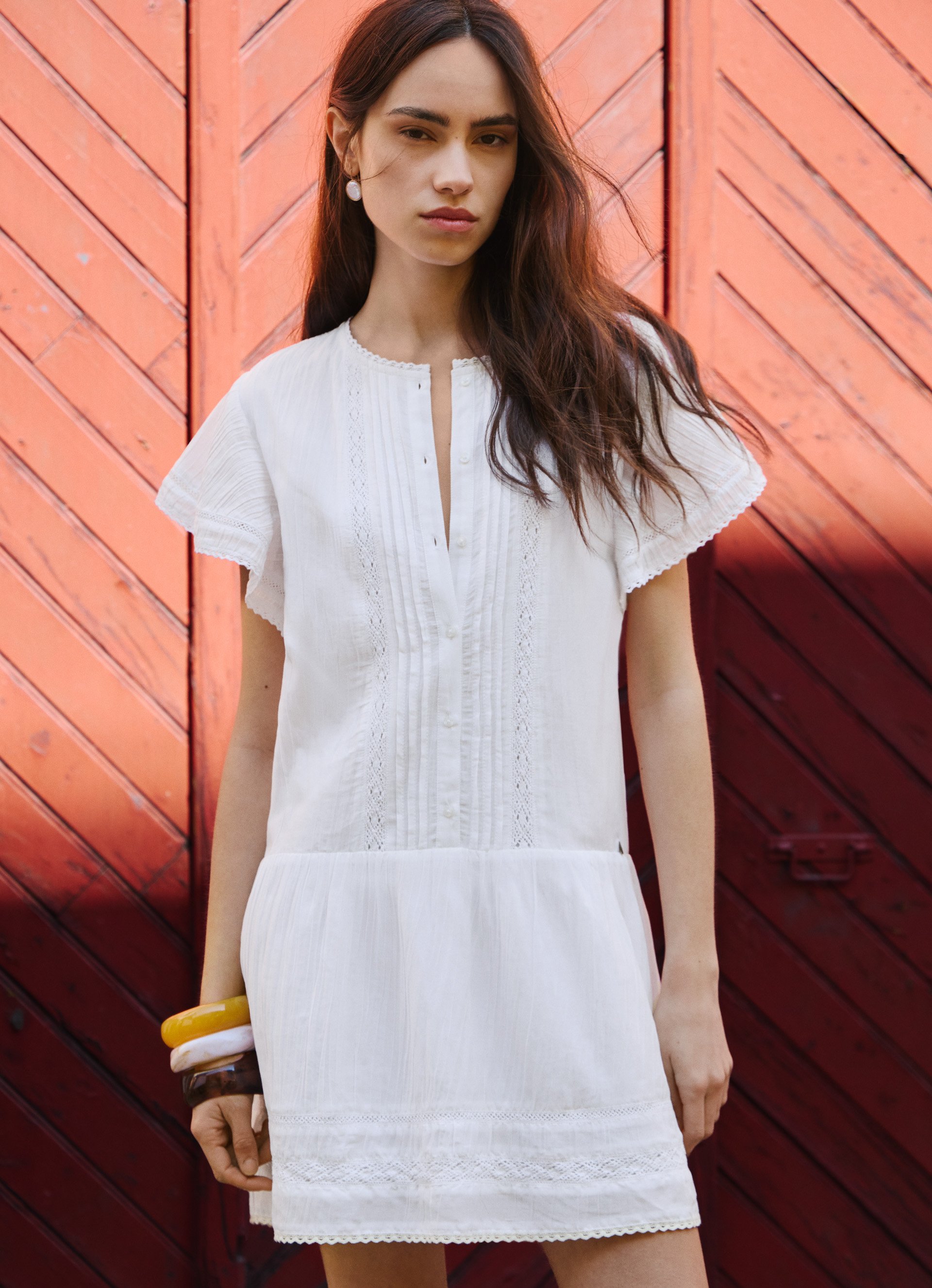- Pleated details and lace around the placket