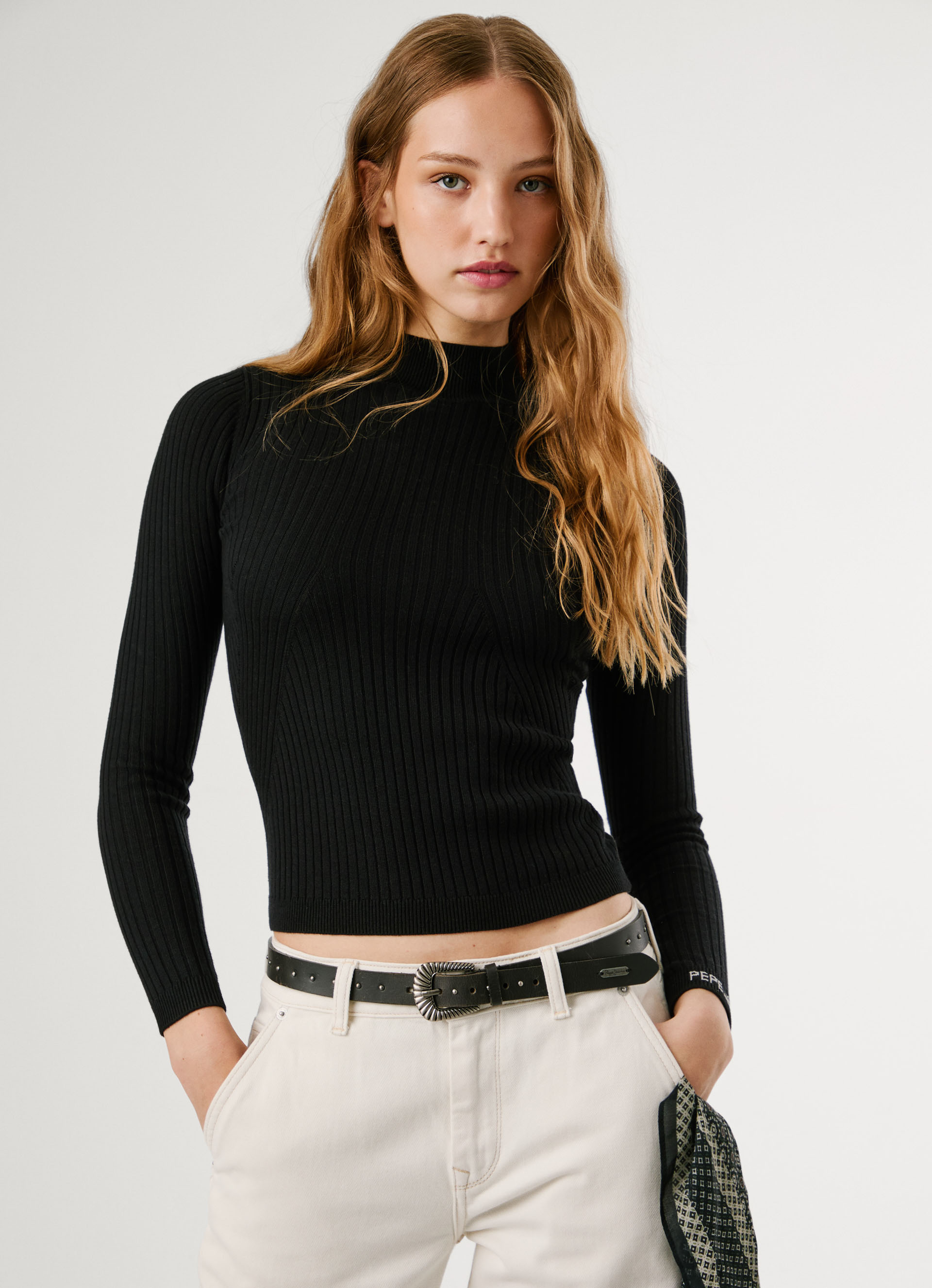 - Dettaglio a costine più sottile su collo, polsini e orlo