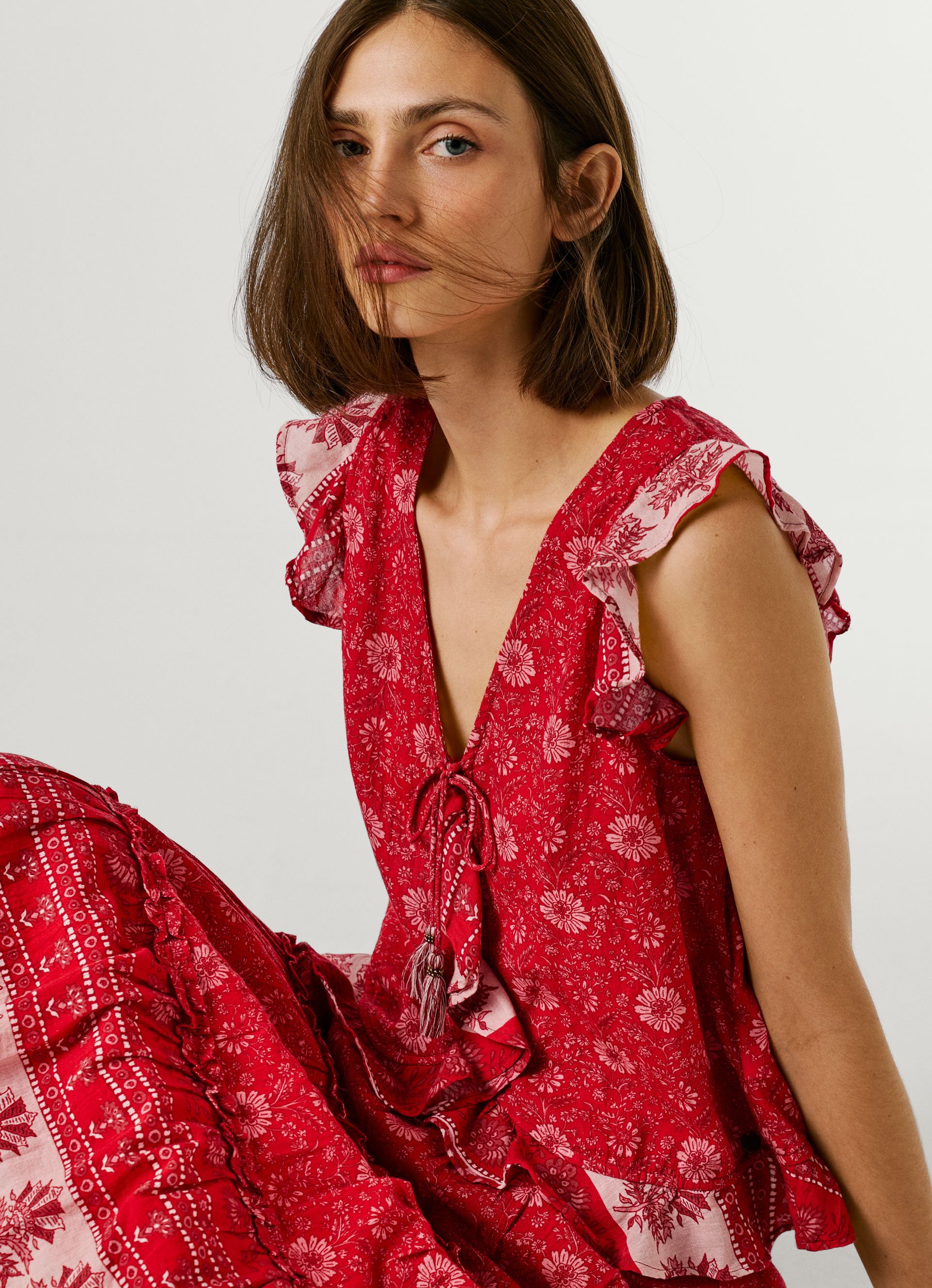 - Decote em V com laço ajustável no decote